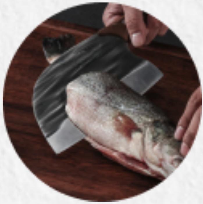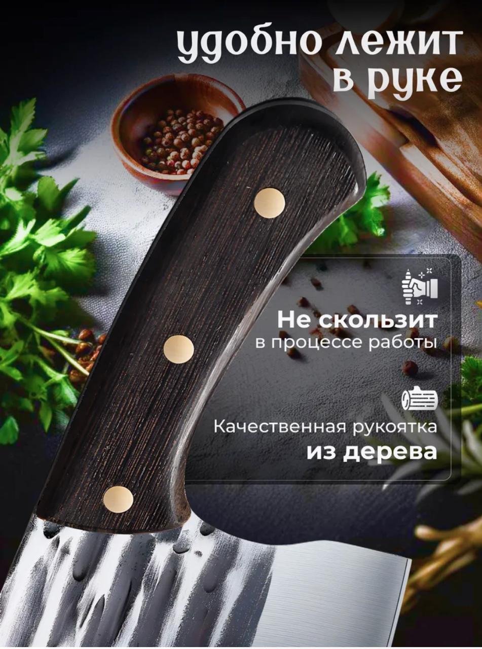 нож для разделки мяса, рыбы, овощей. Его нестандартная форма выгодно отличает его от других кухонных ножей.Вам не потребуется камень для заточки ножей, высококачественная двусторонняя заточка лезвия будет долго сохранять его изначальные режущие качества. Само лезвие выполнено из нержавеющей стали с высоким содержанием хрома.Уникальная конструкция делает его прочным и долговечным. Является идеальным помощником для мясников.Говорят, что дарить ножи, это плохая примета. Однако мы уверены, что этот нож кухонный настоящий подарок для ценителя качественной посуды и в целом товаров для дома и кухни.